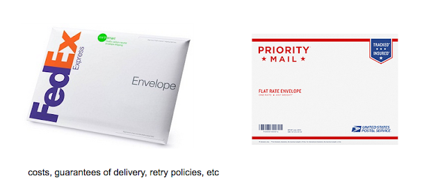 You pick different trade offs between cost and delivery guarantees: re-try policies, tracking numbers, latency, etc.
